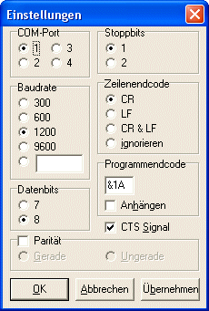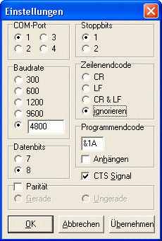 Verbindung zum PC über serielle Schnittstelle (9-poliger Stecker!)
